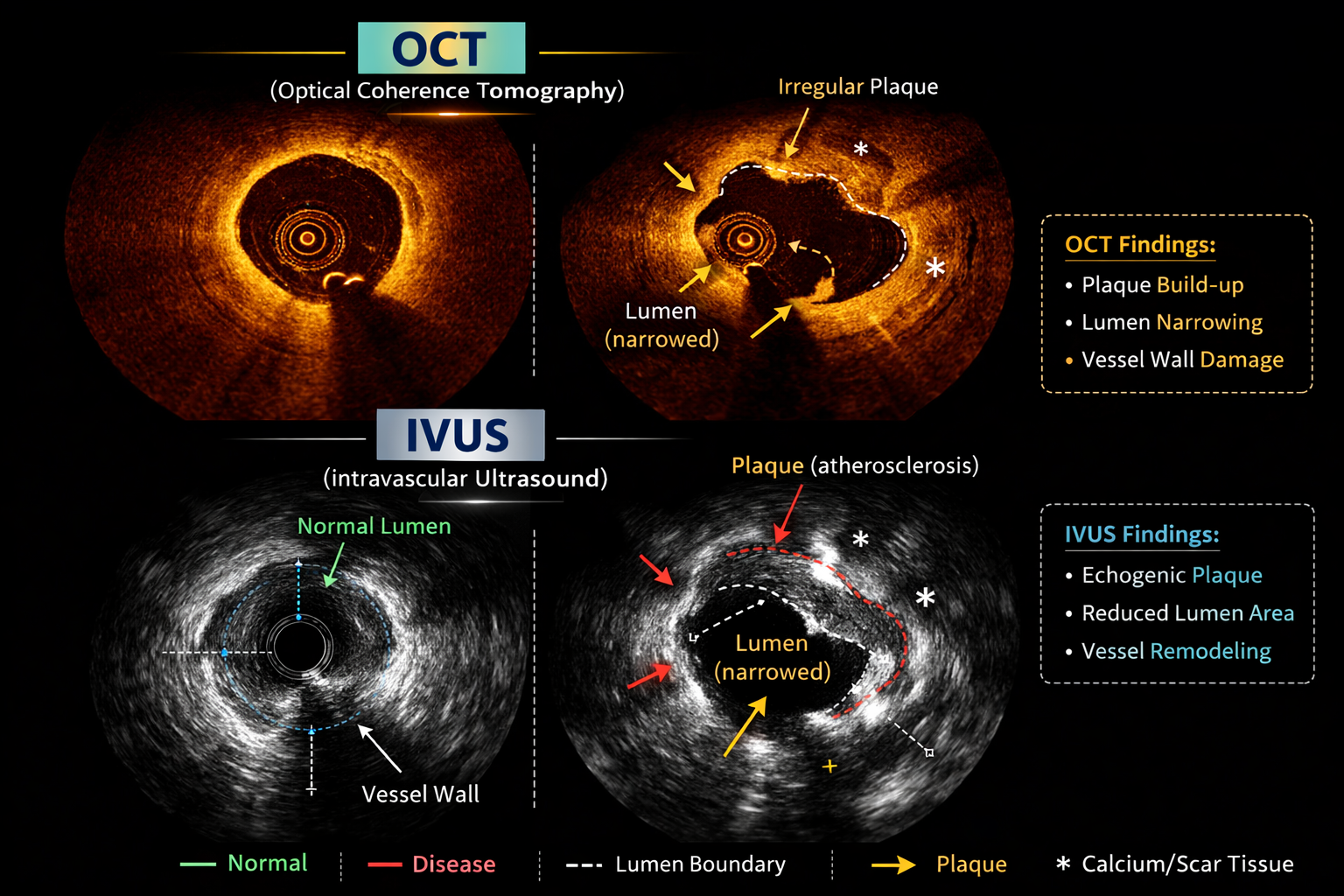 Intravascular imaging refers to inserting a miniature imaging catheter inside the coronary artery to visualize the vessel from within. Unlike angiography, which uses dye and X-rays, these techniques provide cross-sectional images of the artery wall, plaque characteristics, and stent deployment quality.